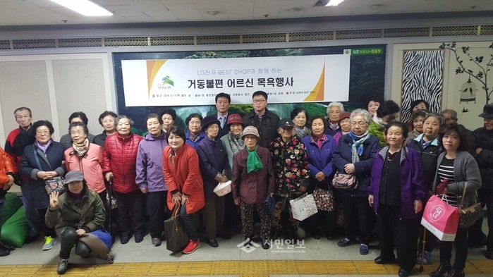 최근 은평구 불광1동은 지역내 LG전자 베스트샵 불광본점과 동주민센터 복지프로그램에 경비를 지원하는 '불우이웃 지원 업무협약'을 체결하고 지역내 목욕탕을 찾아 거동이 불편한 노인 25명에게 목욕 봉사활동을 실시했다. 사진은 관계자들이 기념촬영을 하는 모습.(사진제공=은평구청)