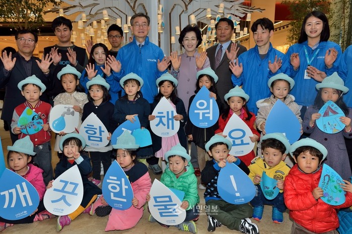 지난 22일 서울 송파구는 롯데월드몰 아트리움에서 유니세프한국위원회와 함께 '세계 물의 날' 캠페인을 진행했다. 사진은 행사에 참석한 박춘희 구청장(가운데)이 관계자들과 기념촬영을 하는 모습.(사진제공=송파구청)