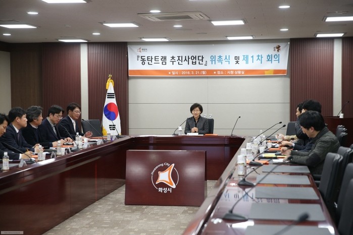 최근 경기 화성시는 동탄2신도시에 도입하는 신교통수단의 합리적 추진을 위해 이화순 화성부시장을 비롯해 주민대표, 시의원, 관계 공무원 등 총 17명의 위원으로 '동탄트램 추진사업단'의 위촉식과 제1차 회의를 실시했다. 사진은 이화순 부시장(가운데)이 회의를 주재하고 있는 모습.(사진제공=화성시청)