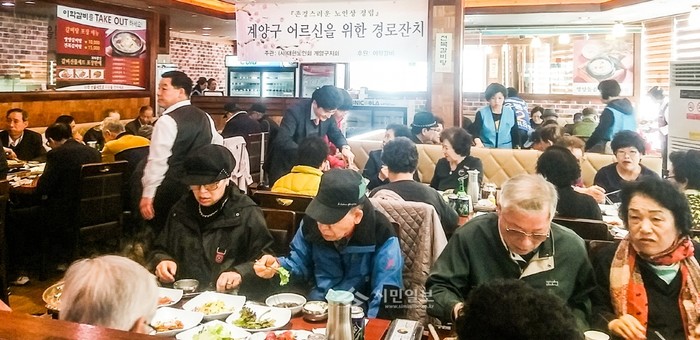 지난 23일 인천시 계양구 계산3동 소재 이학갈비는 지역내 노인 150여명을 초청해 점심식사와 차를 제공하는 경로잔치를 실시했다. 사진은 행사에 참석한 노인들이 식사를 하고 있는 모습.(사진제공=계양구청)