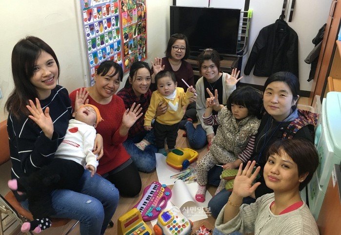 | ▲ 사업에 참가하고 있는 다문화이주여성들이 아이들과 함께 손을 흔들며 환하게 웃고 있다. | ||