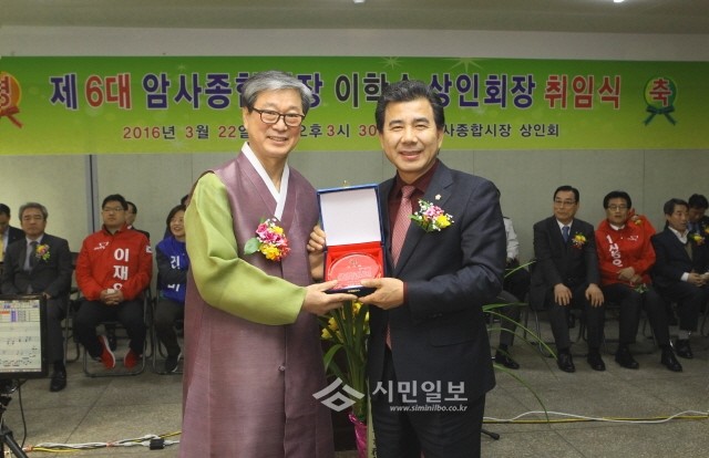 [시민일보=이대우 기자]최근 성임제 서울 강동구의회 의장이 ‘암사종합시장 제6대 상인회장 취임식’에서 상인회원들로부터 감사패를 수여받았다.