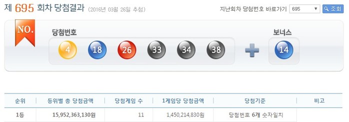 한편 26일 진행된 제695회 나눔로또 추첨에서 당첨번호는 ‘4, 18, 26, 33, 34, 38’으로 결정됐다. 보너스 번호는 ‘14’다.