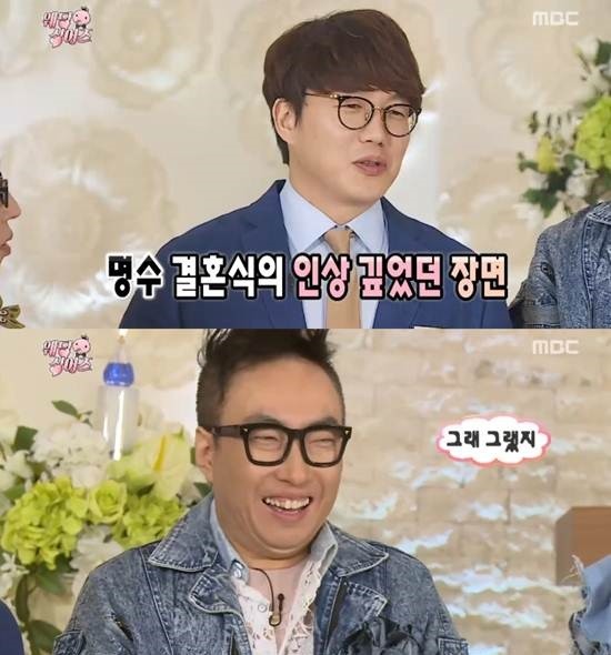 성시경은 이어 "그때 나는 신부 측 부모 얼굴을 보고 있었는데 표정이 많이 어두워지더라"며 "하필 유재석이 박명수에게 장인 장모 바로 앞에서 추라고 시켜서 더 그랬다"고 말해 폭소를 자아냈다.