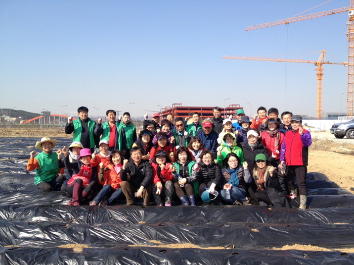 지난 25일 경기 수원시 권선구 평동 새마을협의회는 따뜻한 이웃사랑 실천을 위한 '사랑의 감자 심기' 행사를 전개했다. 사진은 관계자들이 기념촬영을 하는 모습.(사진제공=권선구청)