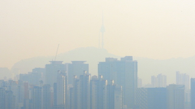 전국이 따뜻한 27일 서울 여의도 국회에서 바라본 남산과 서울시내가 미세먼지 '나쁨'으로 뿌옇게 보이고 있다.