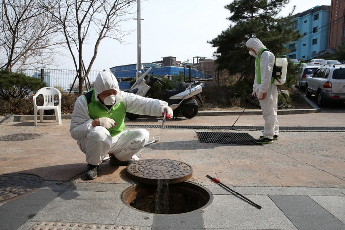최근 서울 성동구는 대현산체육관에서 국내 첫 지카바이러스 환자가 발생한 것에 대비, 정화조·배수로 유충 서식 조사와 유충 구제제를 투여하는 긴급 방역을 실시했다. 사진은 방역기동반이 방역을 진행하고 있는 모습.(사진제공=성동구청)