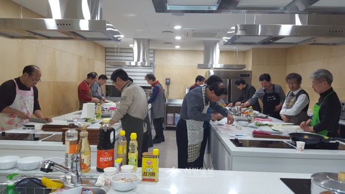 | ▲ '50플러스센터 요리교실'에 참석한 주민들이 음식을 만들고 있다. | ||