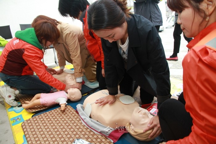 지난 25일 구로소방서는 현대백화점 디큐브시티 광장에서 진행된 '사랑나눔 자선바자 페스티벌' 행사와 연계해 ‘생명을 구하는 사람들 119안전체험’ 행사를 실시했다. 사진은 행사 참가자들이 심폐소생술 실습을 하고 있는 모습.(사진제공=구로소방서)