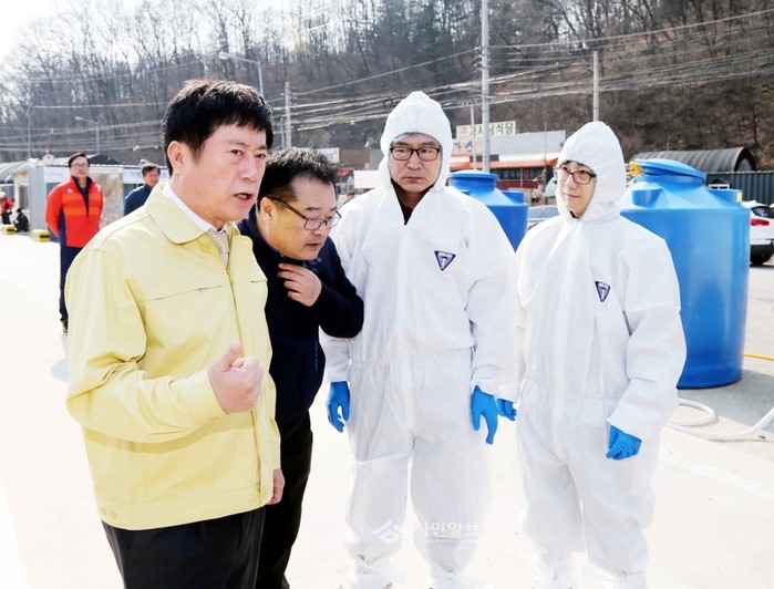 지난 27일 경기 용인시는 최근 이천 지역에서 고병원성 조류인플루엔자(AI)가 발생함에 따라 지역내 유입을 차단하기 위해 양지1초소와 백암2초소 등 2곳에 방역초소를 설치했다. 사진은 정찬민 용인시장(왼쪽)이 초소를 방문해 현장 시찰을 하고 있는 모습.(사진제공=용인시청)