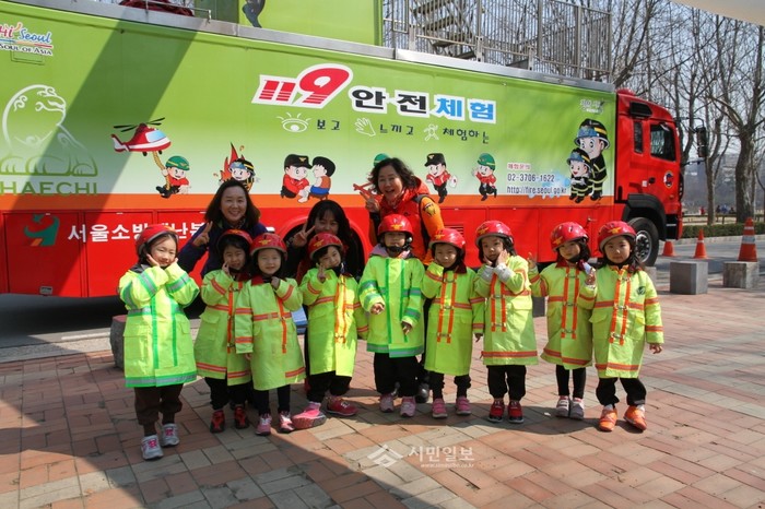 서울 동작소방서는 28일 오전 10시 보라매공원에서 메이플유치원 원아 120명을 대상으로 119이동안전체험차량 소방안전체험을 실시했다. 사진은 교육에 참석한 어린이들이 기념촬영을 하는 모습.(사진제공=동작소방서)