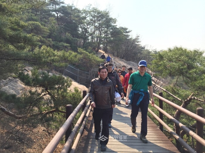 지난 28일 서울 은평소방서는 서장을 비롯해 과장, 단장 등의 간부 소방공무원 및 의용소방대원들을 대상으로 '북한산 둘레길 현장 간부회의'를 개최했다. 사진은 심재강 서장(왼쪽)과 관계자들이 산길을 걷고 있는 모습.(사진제공=은평소방서)