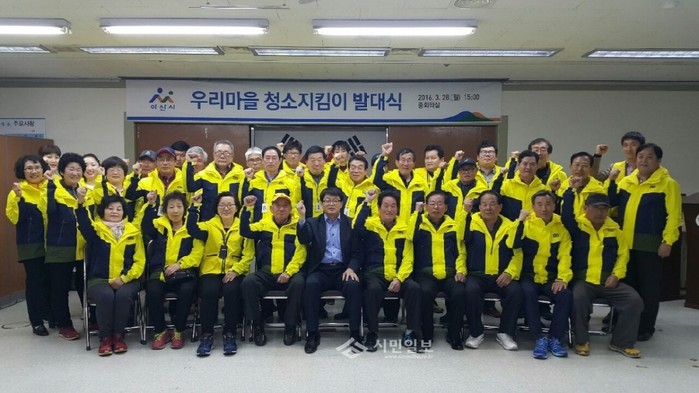 지난 28일 충남 아산시는 ‘깨끗한 충남(아산)만들기’ 사업추진의 일환으로 오는 10월에 개최되는 전국체전과 장애인체전을 청결체전으로 만들고자 ‘우리마을 청소지킴이’ 발대식을 개최했다. 사진은 복기왕 시장(앞줄 가운데)과 청소지킴이들이 기념촬영을 하는 모습.(사진제공=아산시청)