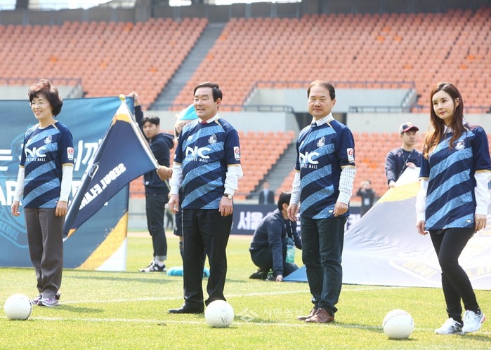 최근 임춘대 서울 송파구의장은 잠실운동장 올림픽주경기장에서 열린 서울이랜드FC와 충주험멜FC의 K리그 챌린지 개막전 경기 시축행사에 참석했다. 사진은 임 의장(왼쪽 두번째)과 박춘희 송파구청장(맨 왼쪽) 및 관계자들이 시축을 준비하고 있는 모습.(사진제공=송파구의회)