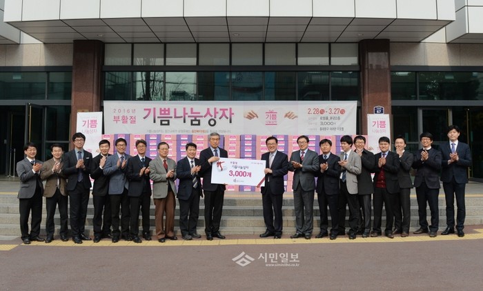 지난 29일 동대문구 이문동에 위치한 동안교회는 최근 지역내 어려운 이웃을 위해 마련한 생필품과 사랑의 메세지를 담은 '기쁨상자' 3000여개를 구에 전달했다. 사진은 유덕열 구청장(오른쪽에서 아홉 번째)과 관계자들이 기념촬영을 하는 모습.(사진제공=동대문구청)
