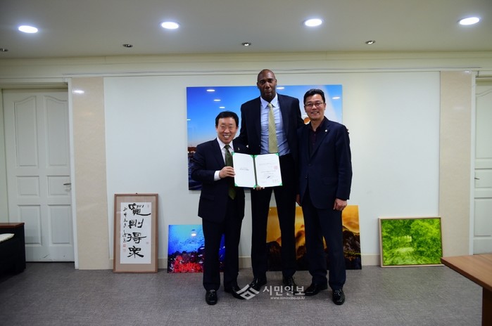 지난 29일 경기 안산시는 안산OK저축은행 프로배구단 소속 시몬(쿠바·29)선수에게 제종길 안산시장, 신성철 안산시의회 부의장, 안산OK저축은행 배구단 관계자 등이 참석한 가운데 명예시민증을 수여했다. 사진은 제종길 시장(왼쪽)이 시몬 선수(가운데)와 기념촬영을 하는 모습.(사진제공=안산시청)