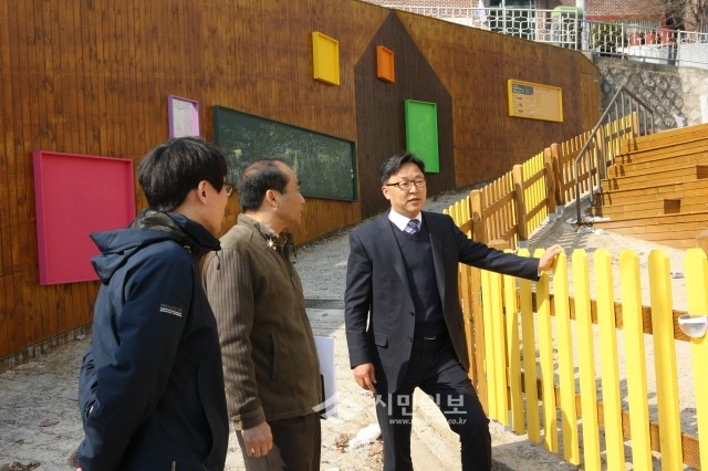 | ▲ 이용균 의원(맨 오른쪽)이 최근 삼양초 주변 범죄예방디자인사업 시행 현장을 찾아 관계자들과 추가 보완 사항에 대해 논의하고 있다. (사진제공=강북구의회) | ||