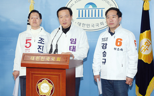 새누리당 공천에서 탈락해 무소속으로 출마한 수도권 내 임태희(가운데), 강승규(오른쪽), 조진형 후보들이 30일 오전 국회 정론관에서 ‘바른 정치를 추구하는 사람들’연대 결성 기자회견을 통해 전날 새누리당 최경환 의원이 선대위 발대식에서 "무소속을 찍는 것은 결국 야당을 찍는 것"이라고 발언한 것에 대해 비판하고 있다.