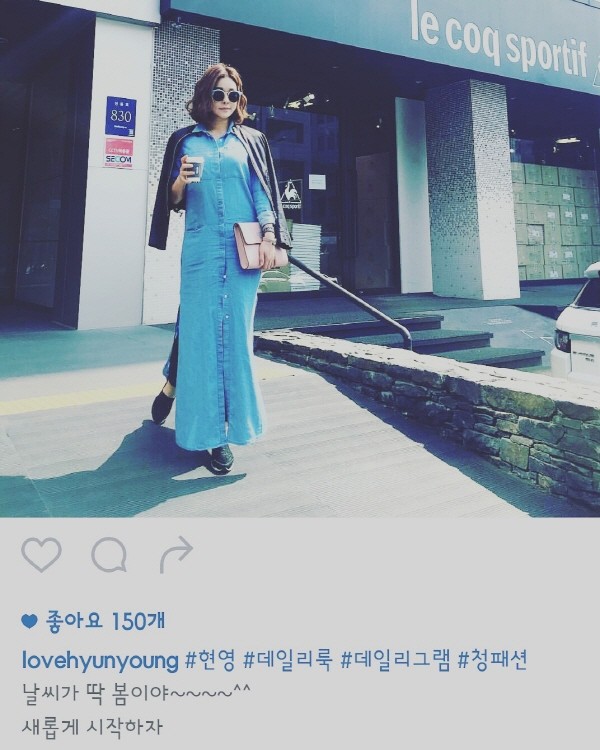현영은 인스타그램에 제이제이마스터 클래식복고 하늘색 선글라스와 청 패션에 가죽 재킷을 걸쳐 헐리우스 톱스타를 연상케 하는 모습의 사진을 게재했다. 그는 사진과 함께 '날씨가 딱 봄이야~~^^' '다시 새롭게 시작하자'라는 글을 통해 그만의 밝교 긍정적인 기운을 담아냈다.