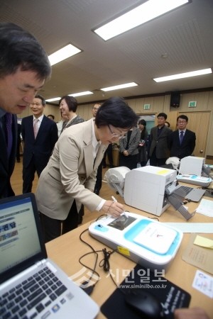지난 30일 강남구는 오는 4.13총선에 대비해 신연희 구청장과 홍윤식 행정자치부 장관 등 관계자들과 함께 세곡동 주민센터에서 열린 '사전투표 모의시험'을 참관했다. 사진은 신 구청장이 직접 모의투표를 하고 있는 모습.(사진제공=강남구청)