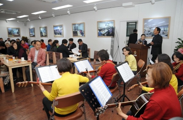 | ▲ 어울터(북카페·전시장), 배움터, 마을학교, 음악실 등 주민들이 함께 소통하며 어울리는 공간이라는 의미를 담고 있는 다다커뮤니티센터 개소식 참가자들이 연주회를 감상하고 있다. | ||