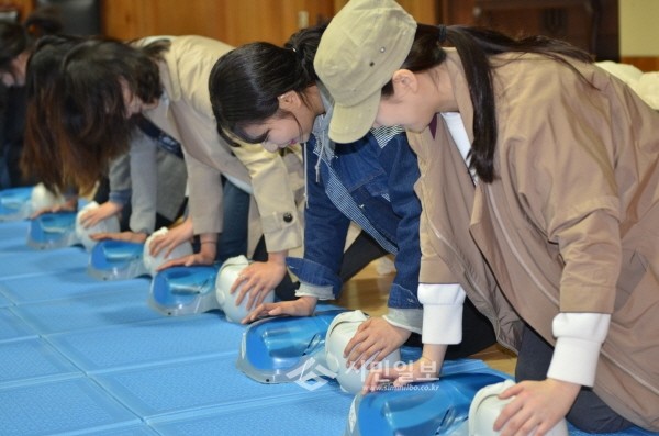 최근 서울 강남소방서는 소방서 5층 강당에서 IVY코리아 학원생 40여명을 대상으로 10만 시민안전파수꾼 양성 교육을 실시했다. 사진은 행사에 참석한 관계자들이 심폐소생술 실습을 하는 모습.(사진제공=강남소방서)