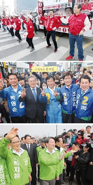새누리당 김무성 대표가 2일 오후 인천시 연수구 NC큐브에서 4.13 총선 인천 연수을에 출마한 새누리당 민경욱 후보와 함께 춤을 추며 시민에게 지지를 호소하고 있다. 더민주 문재인 전 대표가 2일 대전 중구 으능정이 거리를 찾아 시민들에게 대전에서 출마한 더민주 후보들의 지지를 호소하고 있다. 국민의당 안철수 공동대표가 2일 오후 전남 목포시 평화광장에서 전남 서남권 집중유세를 하기 앞서 박지원·박준영 후보와 함께 시민들에게 인사하고 있다.