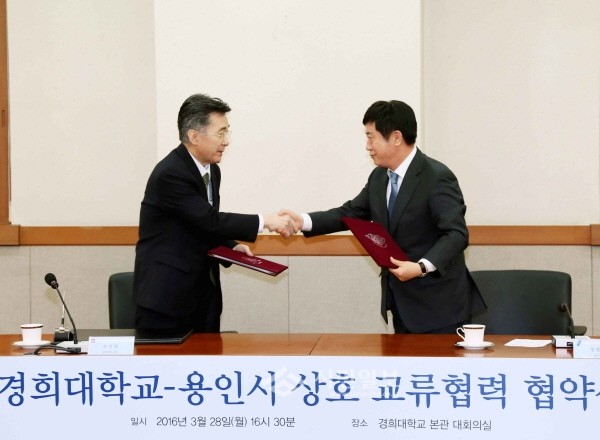 최근 정찬민 경기 용인시장(오른쪽)은 경희대 국제캠퍼스 대회의실에서 조인원 경희대학교 총장과 산학협력 강화를 통해 교육산업을 활성화하기 위한 교류협력 협약식을 체결했다.(사진제공=용인시청)