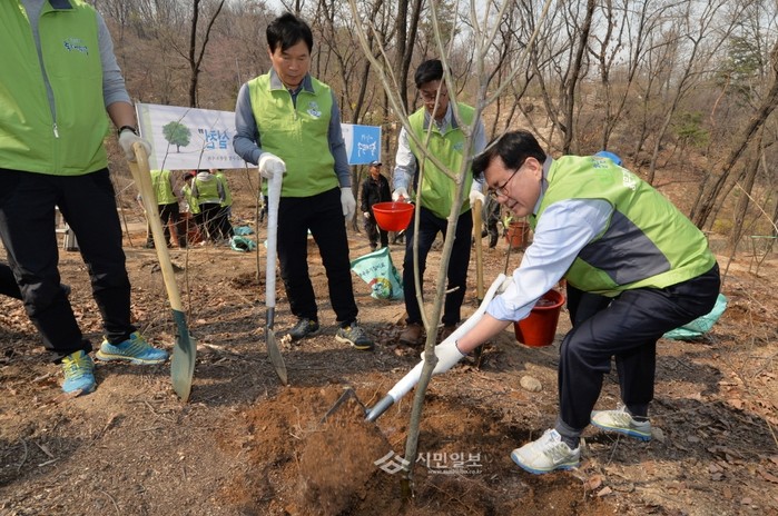 최근 동대문구는 '제71회 식목일'을 맞아 배봉산공원에서 구청 도시관리국 직원 등 100여명이 참석해 ‘2016년 동대문구 나무심기 행사’를 개최하고 밤나무, 산수국, 산철쭉 등 430주의 나무를 심었다. 사진은 유덕열 구청장(오른쪽)이 나무를 심고 있는 모습.(사진제공=동대문구청)