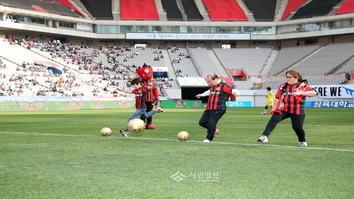지난 2일 서울 마포구 성산동 서울월드컵경기장에서 박홍섭 마포구청장(가운데)이 2016시즌 K리그 클래식 3라운드 FC서울과 인천유나이티드의 경기 시작을 알리는 시축을 하고 있다. 박홍섭 구청장은 경기 전 FC서울과 '마포구-FC서울' 상생발전을 위한 업무협약을 체결했다.(사진제공=마포구청)