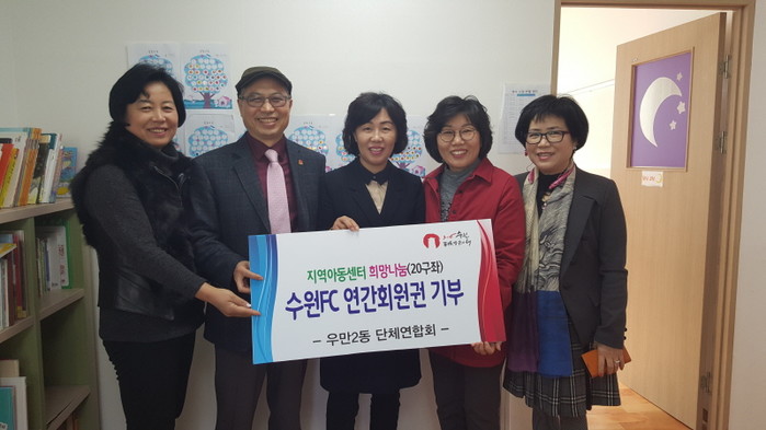 경기 수원시 팔달구 우만2동 주민센터는 최근 우만지역아동센터를 방문해 수원FC 연간회원권 20구좌를 전달했다. 사진은 전달식에 참석한 관계자들이 기념촬영을 하는 모습.(사진제공=팔달구청)