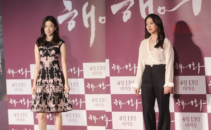 한효주와 천우희는 3월 14일 롯데시네마 건대입구점에서 열린 영화 '해어화' 제작발표회에서 각자의 매력을 뽐낸 스타일로 플래시 세례를 받았다.