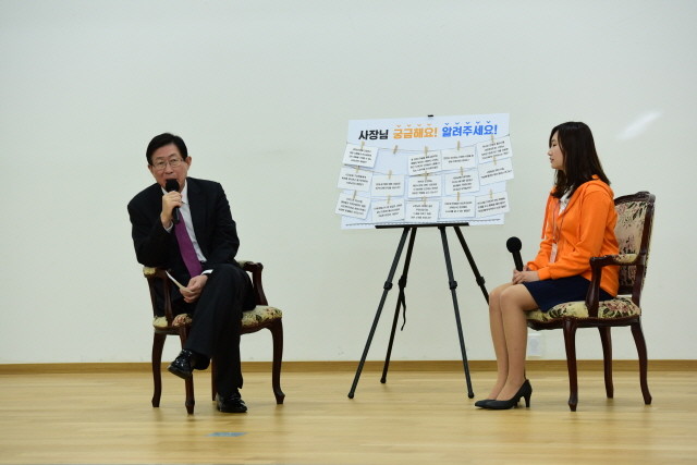 | ▲ 한국전력공사 조환익사장(왼쪽) 과 대학생 블로그 기자와 "사장님과의 토크" 주제로 이야기 하고 있다. | ||
