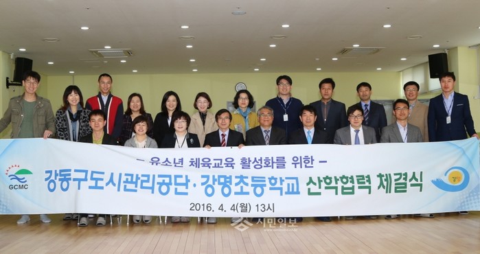 지난 4일 서울 강동구도시관리공단 강동유소년스포츠센터와 강명초등학교가 유소년 체육 활성화를 위한 산학협력을 체결했다. 사진은 행사에 참석한 관계자들이 기념촬영을 하는 모습.(사진제공=강동구도시관리공단)
