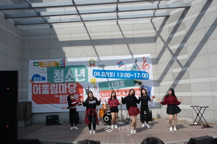 최근 경기 화성시와 나래울청소년문화의집은 나래울 복합복지타운에서 지역내 청소년동아리 10여개와 청소년자원봉사자 150여명 및 지역주민 500여명이 참여한 가운데 2016년 화성시청소년어울림마당 ‘청靑마루’ 개막식을 개최했다. 사진은 행사에 참여한 학생들이 공연을 하고 있는 모습.(사진제공=화성시청)
