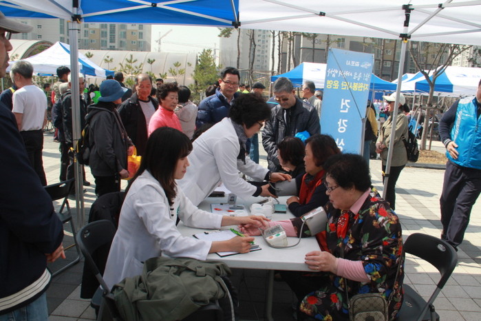 최근 경기 김포시자원봉사센터에서 식사와 건강삼담, 이·미용 서비스 등을 제공하는 '참!좋은 사랑의 밥차'가 구래동 솔터마을3단지에서 주민 300여명이 참여한 가운데 시작했다. 사진은 행사에 참석한 자원봉사자들이 노인들에게 건강 상담을 하는 모습.(사진제공=김포시청)