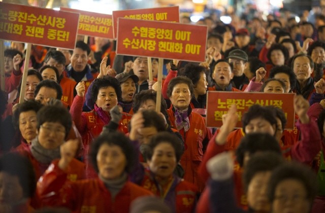 노량진수산시장 '칼부림' 사건이 발생한지 하루가 지난 5일 오전 서울 동작구 노량진 수산시장에서 '노량진 현대화 사업'을 반대하는 노량진수산시장 비상대책위원회 회원들이 일을 잠시 중단한 채 시장 가운데 모여 구호를 외치고 있다.