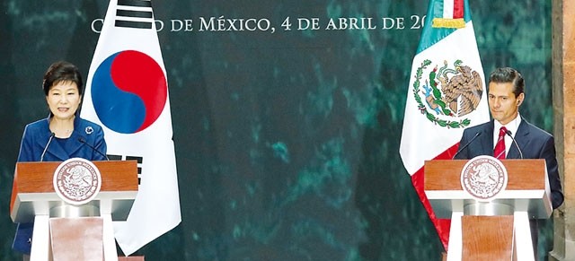 박근혜 대통령과 엔리케 페냐 니에토 멕시코 대통령이 4일 오후(현지시간) 멕시코시티 대통령궁에서 공동 기자회견을 하고 있다. 박양국 대통령은 한ㆍ멕시코 FTA 협상 재개 여부 등을 검토하기 위한 실무협의를 올 4분기 중 개최키로 합의했다.