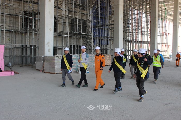 지난 5일 경기 이천소방서와 한국산업안전보건공단 경부동부지사는 호법면 단천리 (주)한섬 이천 물류창고 공사현장을 방문해 물류창고 신축현장의 3대 재해(떨어짐, 무너짐, 화재) 예방을 위한 '합동 CEO 현장지도'를 실시했다. 사진은 조승혁 서장(가운데)이 현장을 둘러보는 모습.(사진제공=이천소방서)