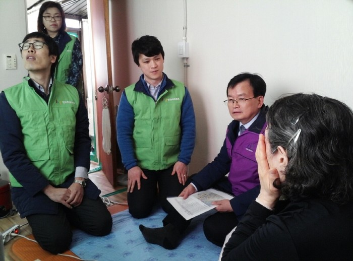 최근 서울 서초구 잠원동주민센터는 한국야쿠르트 사랑의손길펴기회 직원 자원봉사단과 함께 홀몸노인 세대를 방문해 자원봉사를 실시했다. 사진은 관계자들이 노인과 대화를 하는 모습.(사진제공=서초구청)
