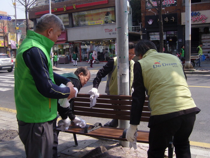 지난 5일 경기 동두천시 중앙동 새마을 남녀 지도자는 오전 11시~낮 12시 지역내 시설물을 중심으로 환경정화활동을 전개했다. 사진은 관계자들이 지역에 설치된 벤치를 청소하는 모습.(사진제공=동두천시청)