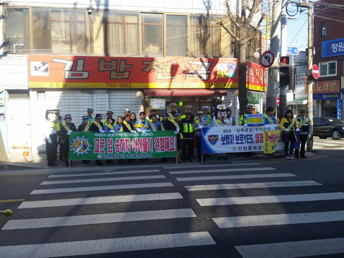 지난 4일 인천중부경찰서 관계자들은 인천 동구 창영초등학교에서 녹색어머니, 모범운전자회, 창영초등학교 교사 등 30명과 함께 '함께해요 착한운전' 유관기관 합동 캠페인을 실시했다.(사진제공=인천중부경찰서)