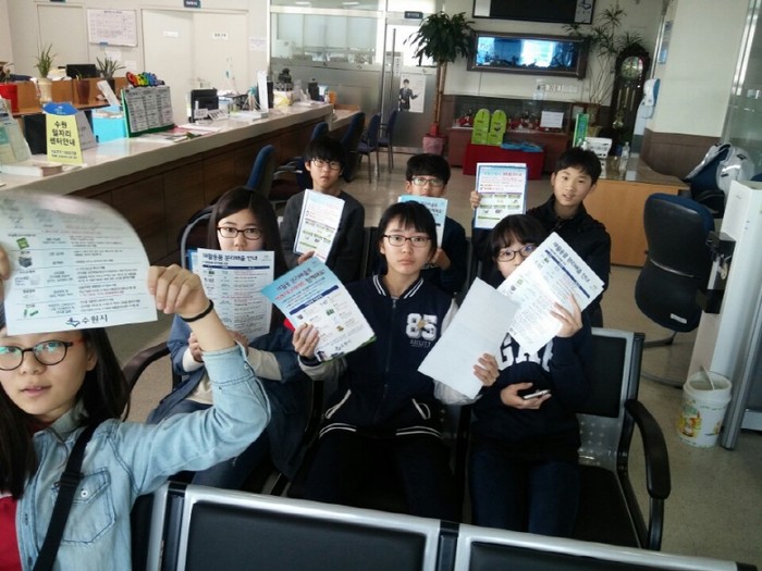 최근 경기 수원시 팔달구 소재 율현초등학교와 율현중학교 학생들로 이루어진 보슬(보람과 슬기) 봉사단 7명이 4월 정기봉사 주제인 ‘쓰레기 분리수거 홍보’를 위해 화서2동 주민센터를 방문했다. 사진은 학생들이 홍보 전단지를 들고 기념촬영을 하는 모습.(사진제공=팔달구청)