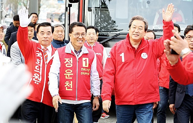 새누리당 김무성 대표가 총선을 일주일 앞둔 6일 오전 전북 전주시 서신동 롯데백화점 사거리에서 열린 전북권 합동 지원유세에 입장하다 당원들과 지지자들을 향해 손을 들어 인사하고 있다.