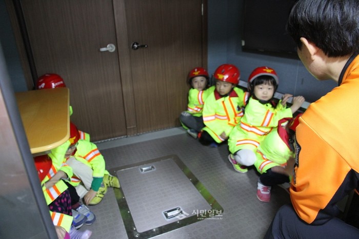 지난 6일 마포소방서는 중동에 위치한 신북초등학교에서 1학년 학생 150명을 대상으로 이동안전체험 차량을 동원해 지진체험, 화재 대피 요령, 피난기구 사용 등 재난 발생시 행동요령에 대한 '이동안전체험 교육'을 실시했다. 사진은 행사에 참가한 아이들이 재난시 행동요령 실습을 하는 모습.(사진제공=마포소방서)