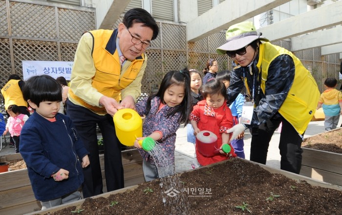 지난 6일 서울 동대문구청 옥상텃밭에서 열린 '모종심기 행사'에 참석한 유덕열 구청장(왼쪽에서 두 번째)과 지역내 어린이들이 모종을 심고 물을 주고 있다.(사진제공=동대문구청)