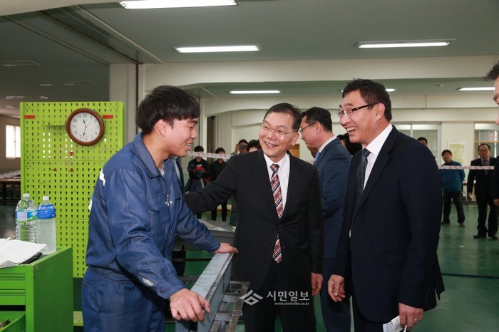 지난 6일 전남도 숙련 기술인들의 축제인 ‘2016년도 전남도 기능경기대회’가 순천공고 한솔관에서 장만채 전남도교육감을 비롯한 내·외빈, 선수 등 400여명이 참석한 가운데 개막했다. 사진은 장 교육감(가운데)이 참가자를 격려하는 모습.(사진제공=전남도교육청)
