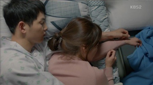 최근 매회 시청률 30%를 가뿐히 넘기고 있는 KBS2 수목드라마 '태양의 후예'. 지난 7일 방송분 가운데 유시진(송중기 분)과 강모연(송혜교 분)이 병실 데이트 장면이 분당 최고 시청률을 차지했다.