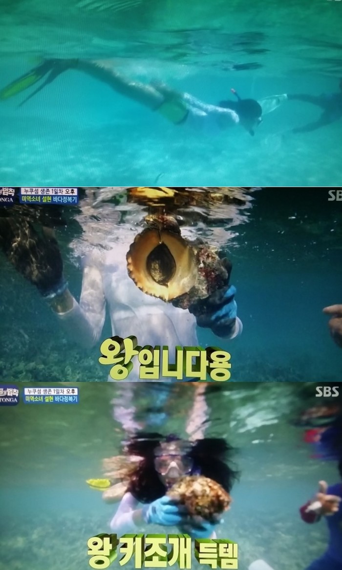 특히 바닷속 깊은 곳 까지 들어가서 대형고동도 잡아내고 대형키조개도 잡아내 바다사냥에 성공했다.