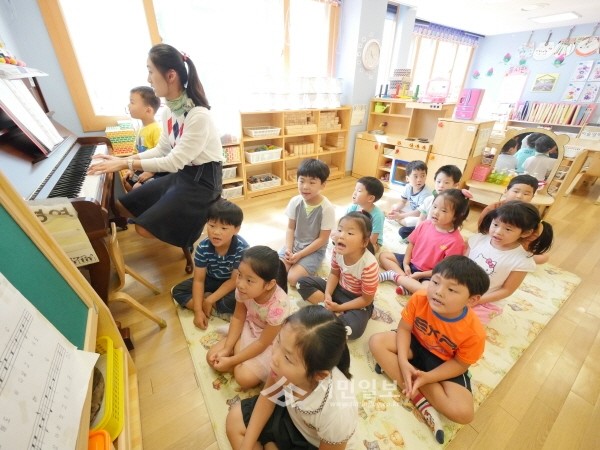 | ▲ 어린이집에서 어린이들이 피아노 반주에 맞춰 노래를 부르고 있다. | ||